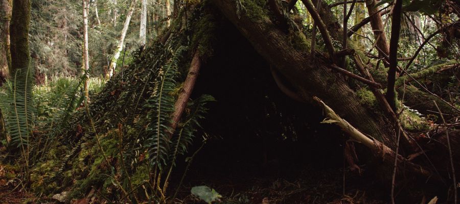 Ihr seid tief im Wald unterwegs und es beginnt zu regnen? Keine Regenjacke dabei? Dann bietet euch der Wald alles, was ihr für einen Unterschlupf braucht.